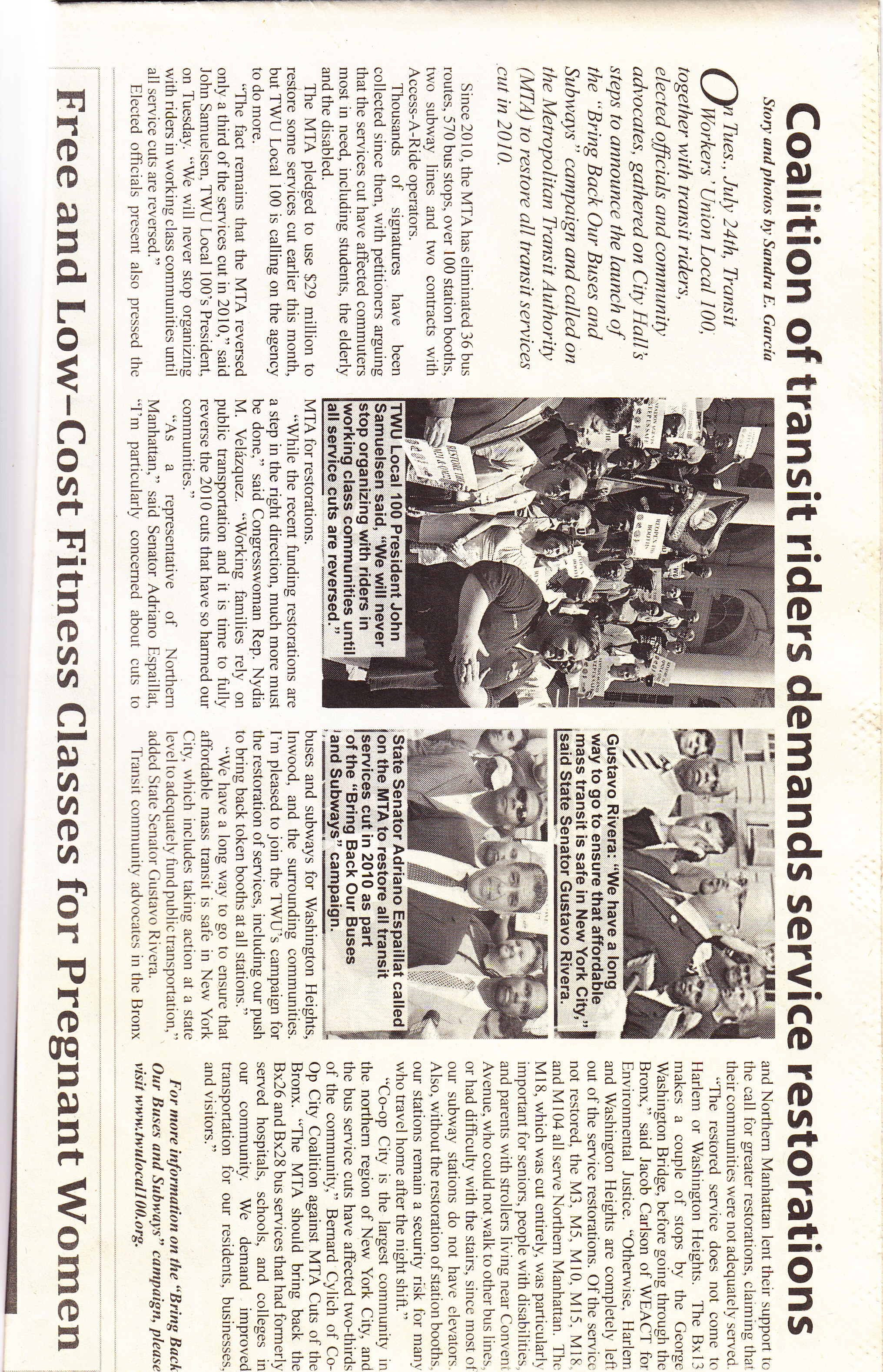 Manhattan Times: Coalition of Transit Riders Demand Service Restorations; WE ACT's Jake Carlson is quoted voicing the concerns of inequitable service (also online) (August 3, 2012)