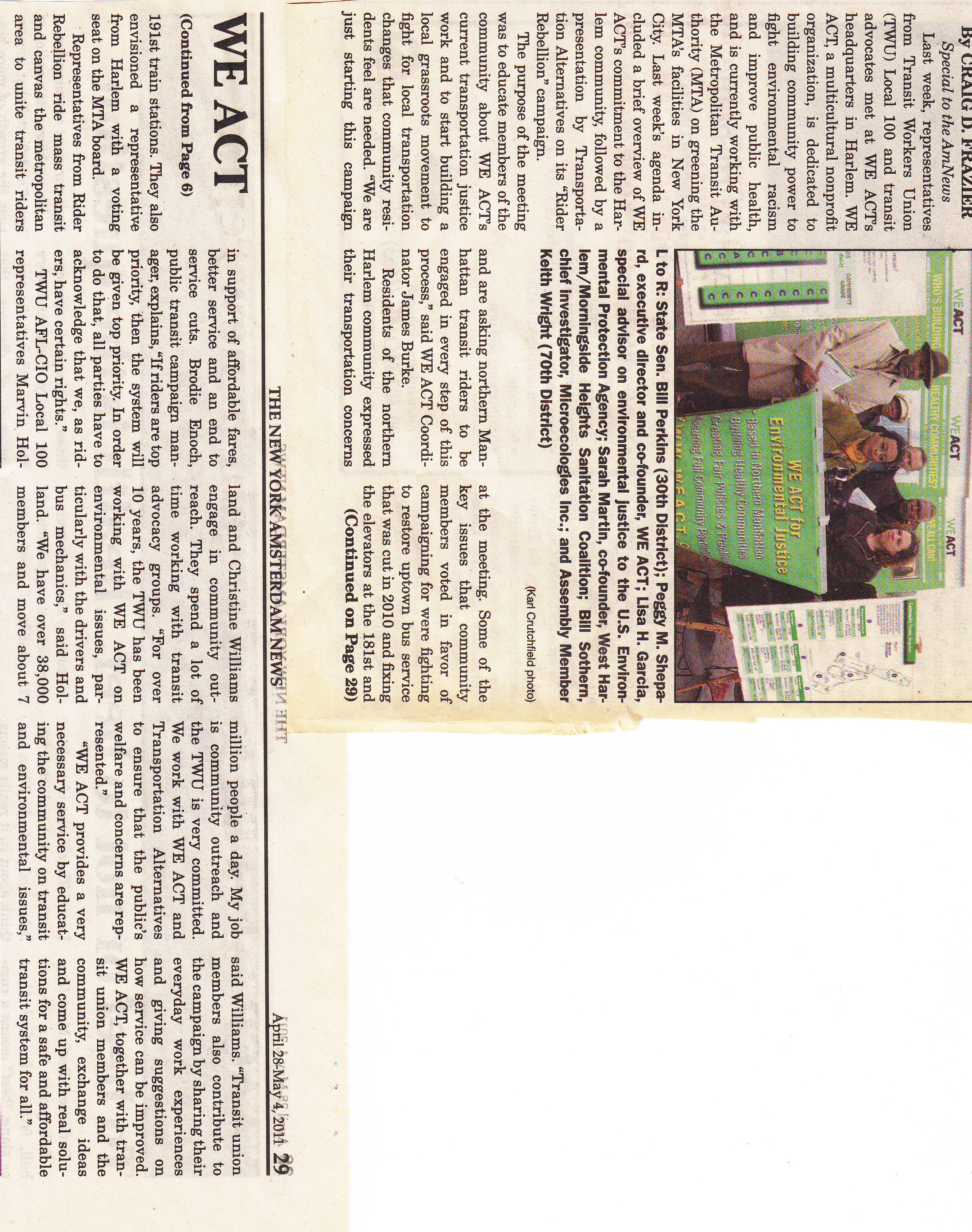 Amsterdam News: TWU Local 100 Workers Work with WE ACT (April 28 - May 4 2011)